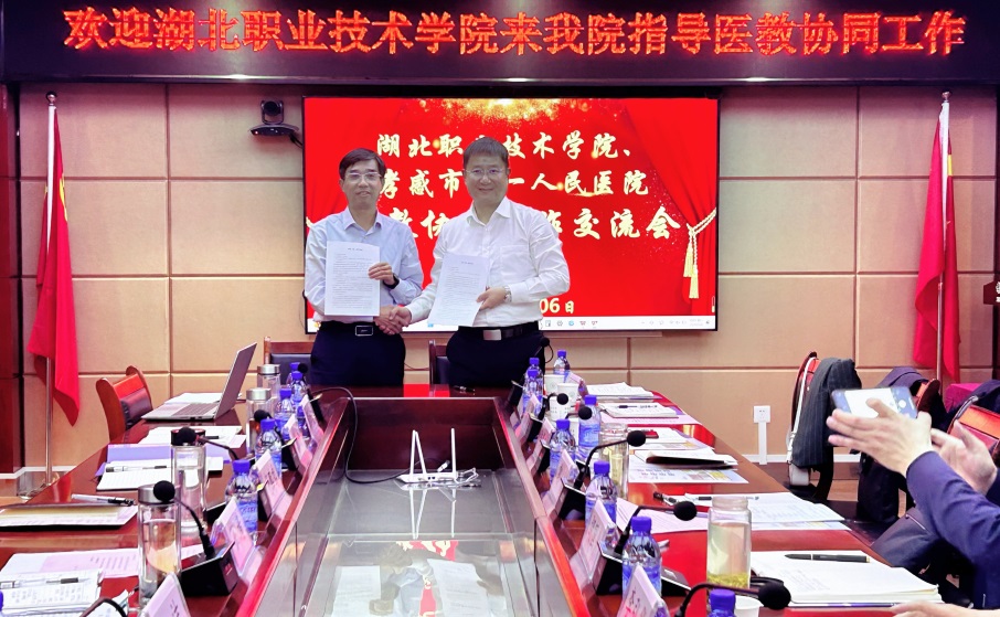 交流发言后,学校校长郭沙和孝感市第一人民医院院长代立武在孝感市第一人民医院会议室续签了校院合作协议。