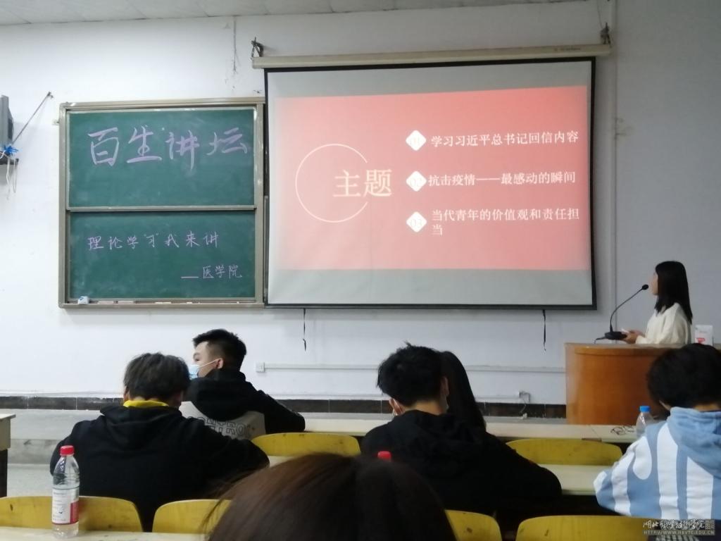 “百生讲坛”旨在用习近平新时代中国特色社会主义思想武装头脑、教育青年学生,把深入学习宣传贯彻党的十九大精神作为首要政治任务和核心工作,以“四进”为手段、以“四信”为目标,通过“进支部、进社团、进网络、进团课”,灵活创新形式方法,引导帮助青年学生和团学干部树立对党的科学理论的信仰,坚定跟党走中国特色社会主义道路实现中国梦的信念。2020年,开云kaiyun登录入口各团支部在校团委和团总支的指导下开展了一系列主题团日活动,立足专业特色,深入学习习总书记关于青年工作的重要思想。结合学习生活实际,举办了各具特色的主题活动,涌现出一批优秀的理论学习达人,他们代表了医学生最响亮的声音、最激昂的青春。